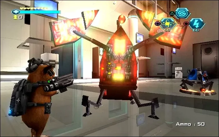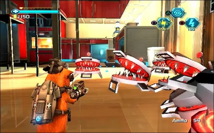 Неудивительно, что это главные враги в этой игре. Но Дарвин даже близко не беспомощен: различные пушки и гаджеты, например. Для их уничтожения используются реактивный ранец, электронный кнут или крюк. Большую часть времени проводят в боях, но есть и головоломки. Многие из них требуют использования мухи Mooch. Его можно вызвать в любое время, он способен достигать возвышенностей, отключать электронные устройства, пролетать через небольшие дыры и даже замедлять время, чтобы преодолевать быстро движущиеся препятствия.