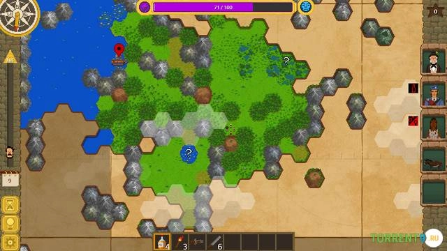 Путешествие происходит на гексагональной карте, покрытой "туманом войны". Каждый шаг или действие – будь то сбор ресурсов, исследование руин или взаимодействие с местными племенами – расходует очки действия и влияет на шкалу рассудка вашей команды. Поддержание баланса между продвижением вперёд и заботой о своей команде становится ключевым аспектом выживания.