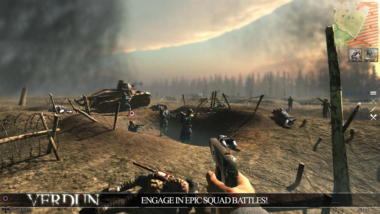 Успех в Verdun критически зависит от эффективной командной работы и тактического взаимодействия. Игроки выбирают одну из нескольких наций, представленных в игре (например, Францию, Германию, Великобританию), и формируют отряды, состоящие из четырех уникальных классов. Каждый класс обладает своим набором оружия и специальных способностей, которые можно использовать для поддержки команды. Например, командир отряда может вызывать артиллерийский обстрел или газовую атаку, инженеры могут ремонтировать колючую проволоку, а снайперы обеспечивают огневую поддержку с дальней дистанции.