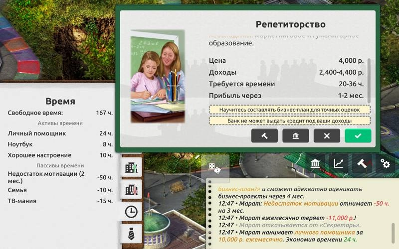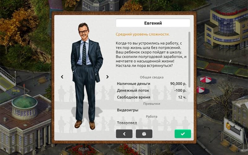 Начинается ваш путь с создания персонажа и выбора первой скромной работы. Каждая игровая неделя или месяц предоставляют вам возможность принимать решения: куда вложить заработанные деньги, как использовать свободное время и какие навыки развивать. Можете проходить курсы для повышения квалификации, искать более высокооплачиваемую работу, инвестировать в акции или недвижимость, а также открывать собственный бизнес.
