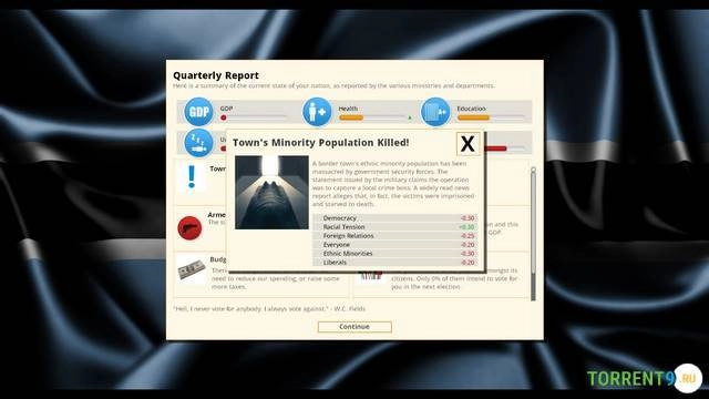 Глубокая симуляция. Разработка Positech Games предлагает сложную модель политического управления, где каждое решение влияет на широкий спектр параметров – от экономики и социального благополучия до общественного мнения и политической стабильности. Игроку необходимо учитывать настроения различных групп населения, их идеологии и потребности.