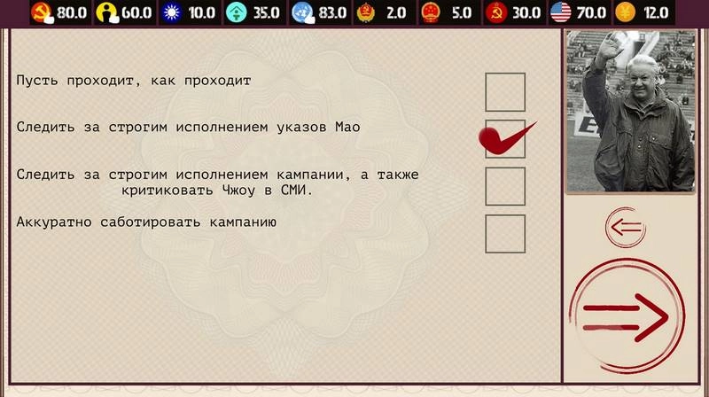 Геополитическое влияние. Взаимодействуйте с глобальными державами, формируя новые альянсы и разрешая международные конфликты. Управляйте отношениями с США, Советским Союзом (впоследствии Россией), странами Юго-Восточной Азии и развивающимися государствами, расширяя экономическое и политическое влияние Китая на мировой арене.