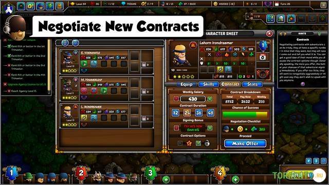 Разнообразие героев. Нанимайте уникальных персонажей, каждый из которых обладает собственными классом, набором навыков, характером и предысторией. Проводите тренировки, улучшайте их снаряжение и развивайте их таланты, чтобы они могли справляться с самыми сложными испытаниями.
