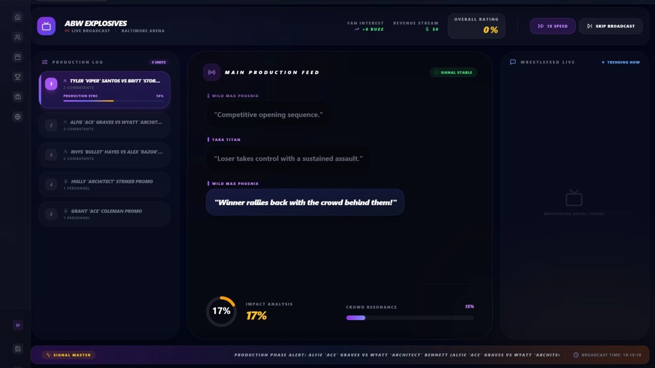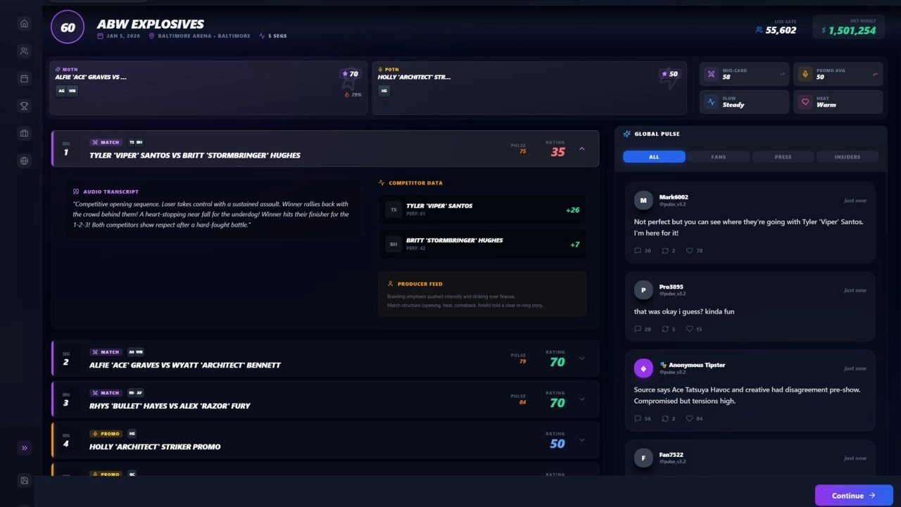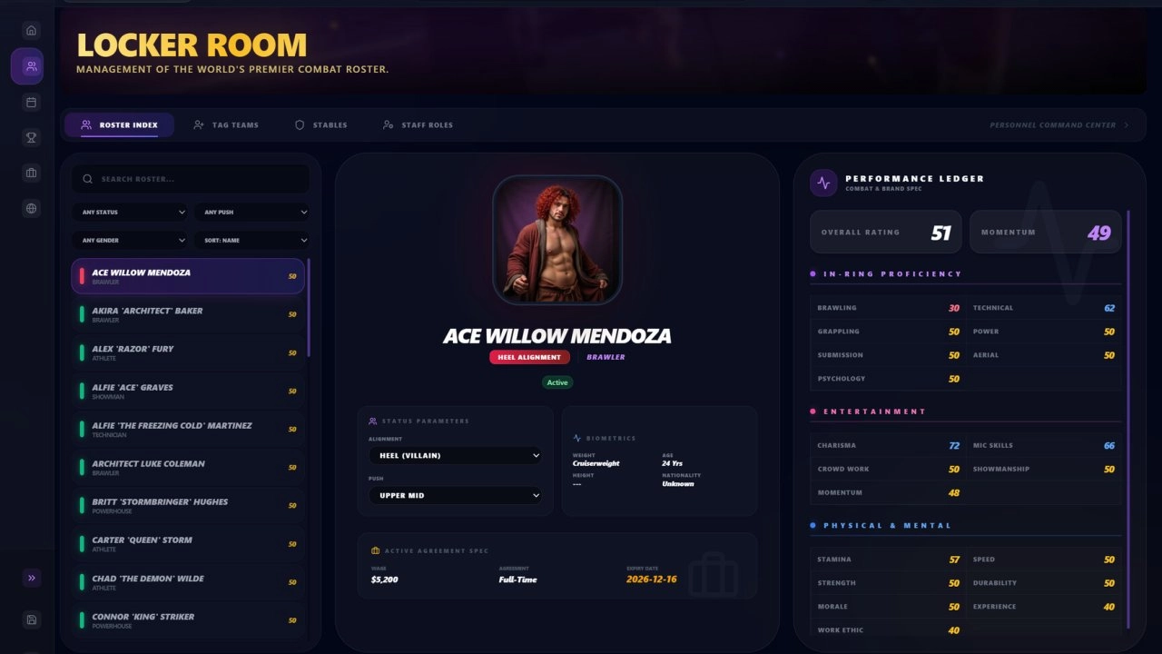 Глубокое управление командой. Игроку предстоит управлять не просто набором характеристик, а живыми личностями со своими стремлениями и слабостями. Мораль, амбиции, популярность и эго каждого рестлера – ключевые факторы, влияющие на их производительность и лояльность к промоушену.