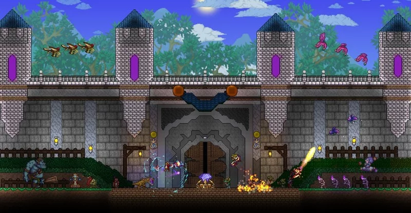 Terraria это двухмерный платформер, посвященный исследованию и крафту. Игроки могут использовать мины и кирки для сбора различных предметов из окружающей среды, включая дерево, руду и даже паутину. Ресурсы, полученные из окружающей среды, можно размещать или создавать из самых разных предметов. Простая система крафта автоматически перечисляет все предметы, для изготовления которых у вас есть материалы. Первым приоритетом является создание базы до наступления темноты, чтобы защитить себя от бродячих зомби и глазных монстров.